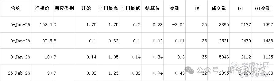 (3)美团:1月最大持仓范围100-137.5,窝轮牛熊街货分布90-115,今收101.0,下跌03.35%。期权盘路交易变化超过1000张的仓位如下,市场对美团还是窄幅震荡。富婆还是那个观点,美团的基本面没有发生改变前,股票大涨的可能性不大,不跌就不错了,短期内大概率会100上下窄幅震荡。