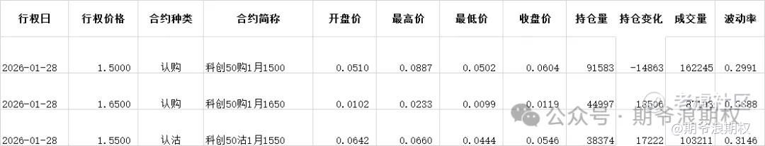 (2)科创50ETF:1月最大持仓范围1400-1500,今收1.531,上涨0.72%。期权1月主力合约,认购和认沽都是低行权价减仓高行权价增仓。认购减仓集中在1300-1500,合计2.9W张,增仓主要集中在1650-1700,合计2.7W张;认沽减仓较少,增仓集中在1450-1650,合计3.9W张。变化超过1W张的仓位如下:
