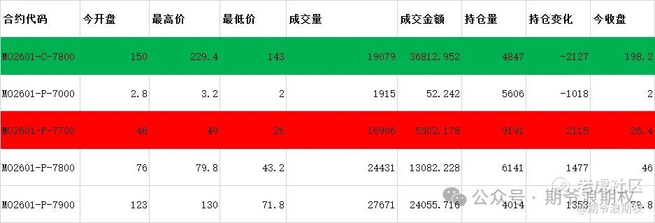 (4)中证1000期权:1月最大持仓范围7700-8000,今收7971.59,上涨0.82%。期权1月主力合约,认购和认沽都是低行权价减仓高行权价增仓。认购减仓集中在7300-7800,合计4000张,增仓集中在7900-8300,合计1000张;认沽减仓集中在6600-7200,合计2300张,增仓集中在7400-8200,合计6800张。变化超过1000张的仓位如下,红色是增仓较大的,绿色是减仓较大的。