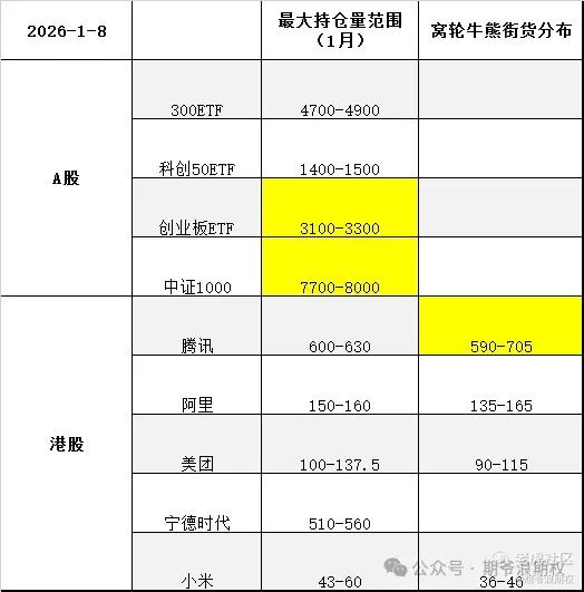 下图是今天大A的3个ETF和中证1000,以及港股的腾讯、阿里、美团、宁德和小米的最大持仓量范围以及窝轮牛熊分布范围,也就是1月的期权筹码分布,黄色的表示跟上个交易日有变动。