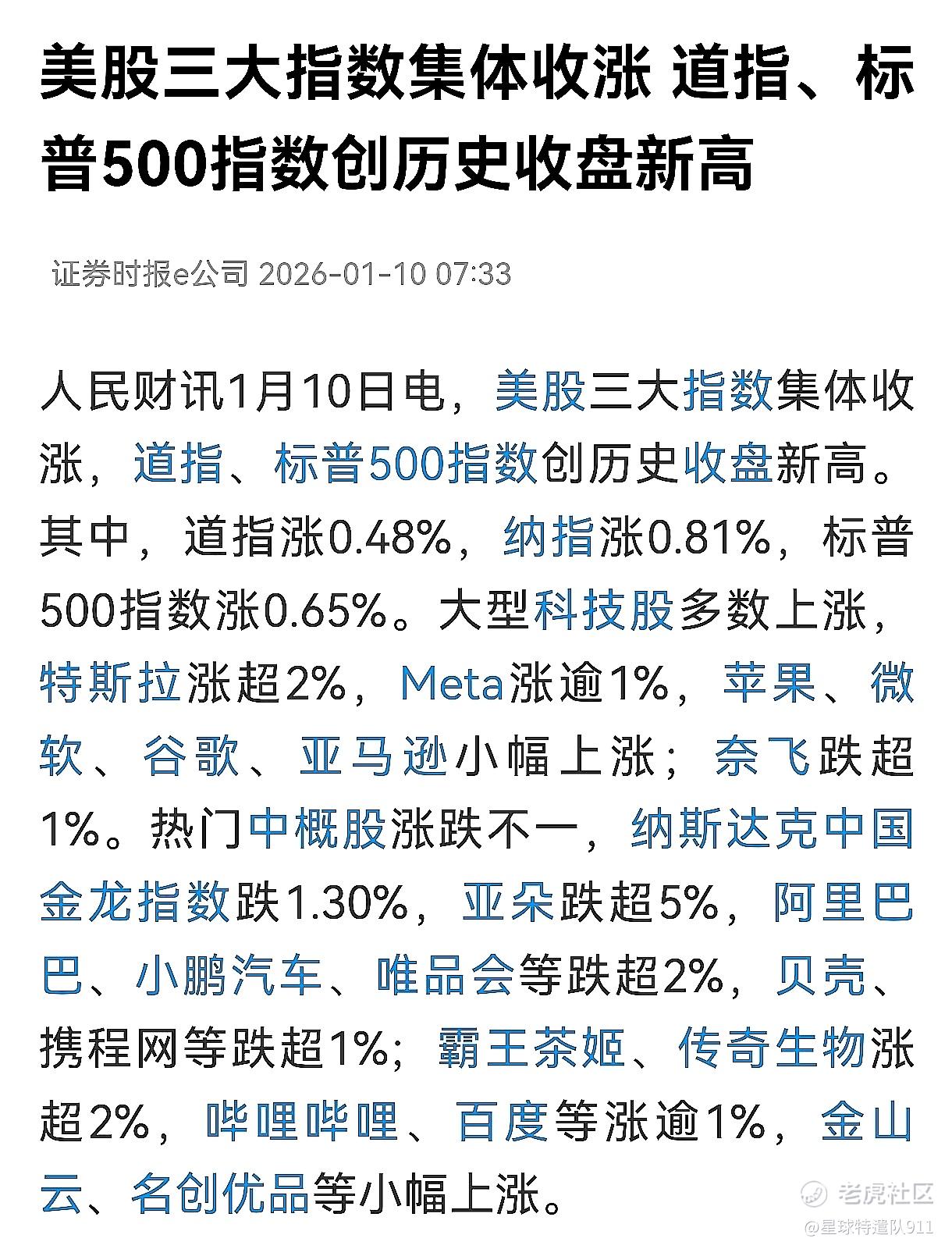 美股三大指数集体收涨,道指、标普500指数创历史收盘新高。其中,道指涨0.48%,纳指涨0.81%,标普500指数涨0.65%。大型科技股多数上涨,特斯拉涨超2%,Meta涨逾1%,苹果、微软、谷歌、亚马逊小幅上涨;奈飞跌超1%。热门中概股涨跌不一,纳斯达克中国金龙指数跌1.30%,亚朵跌超5%,阿里巴巴、小鹏汽车、唯品会等跌超2%,贝壳、携程网等跌超1%;霸王茶姬、传奇生物涨超2%,哔哩哔哩、百度等涨逾1%,金山云、名创优品等小幅上涨。