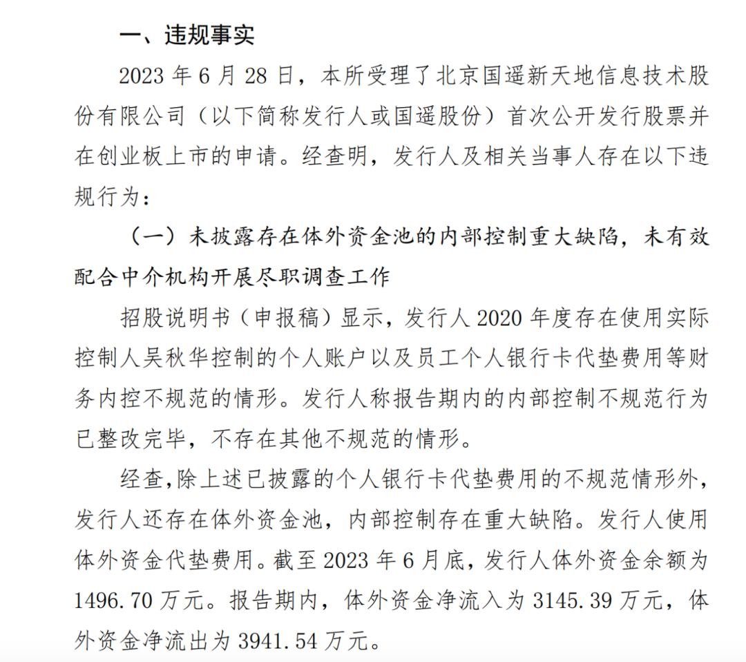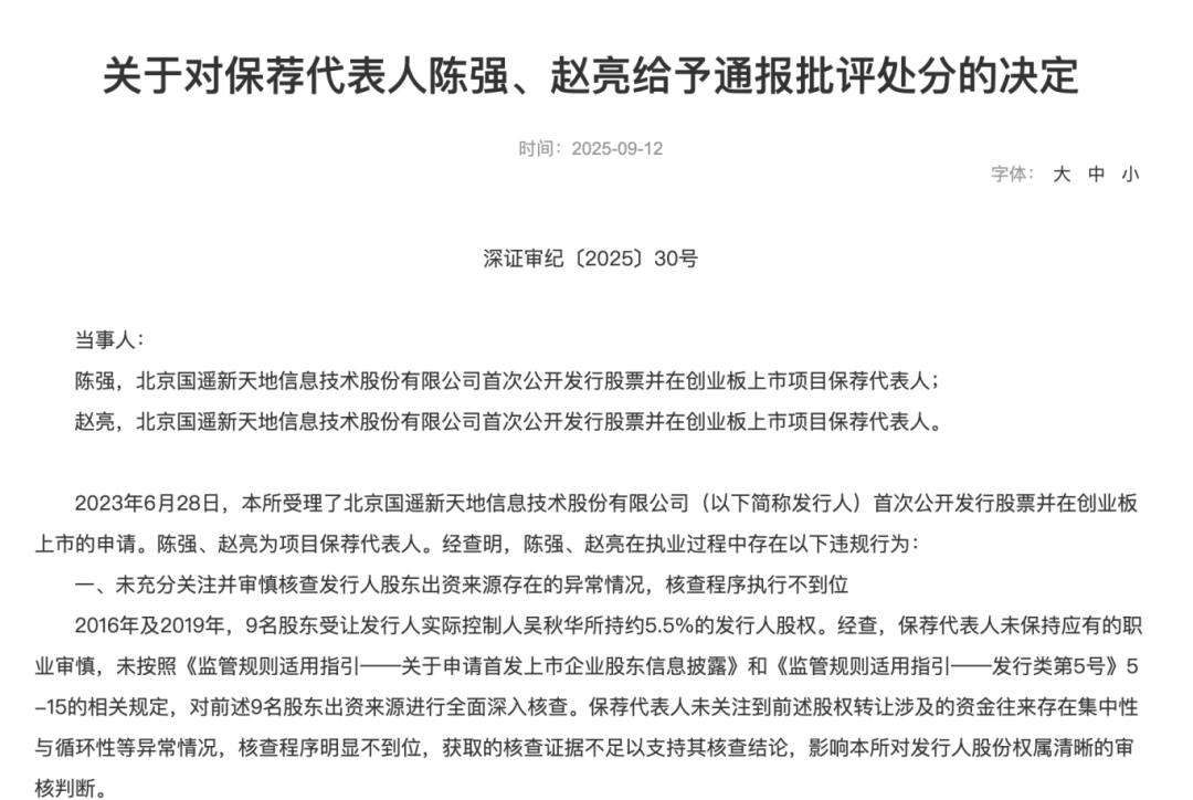 最新深交所审核动态再现现场督导威力:国遥股份实际控制人吴秋华大额资金拆借、体外资金往来!中信建投保荐代表陈强、赵亮被通报批评并列 C类!交易所一年内不接受公司上市申请!会所律所等签字人也被通报批评!