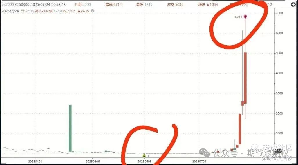 1、盈利方面:买入看涨期权,如果标的大涨了,理论上暴富是可行的。去年7月的多晶硅和港股宁德时代,都有1000倍以上的行情。下图是多晶硅2509的50000购行情图: