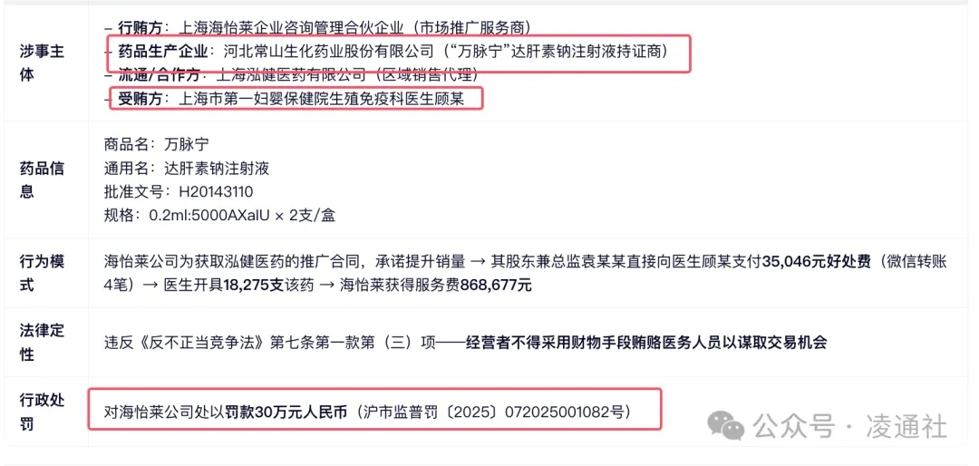 上述事实,主要由询问笔录、《信息服务协议书》、微信转账行贿记录、市场推广和信息服务费发票、授权委托书等材料证明。普陀区市场监督管理局于2025年8月向当事人送达了《行政处罚听证告知书》(沪市监普听告〔2025〕072025001082号)。普陀区市场监督管理局认为,当事人在从事万脉宁药品市场推广和信息服务过程中,采用给予医师财物的手段来增加万脉宁药品销量,以期从泓健医药公司获取可观的市场服务费用的行为,违反了《中华人民共和国反不正当竞争法》第七条第一款第(三)项“经营者不得采用财物或者其他手段贿赂下列单位或者个人,以谋取交易机会或者竞争优势”之规定,构成商业贿赂行为,决定对当事人作出罚款(人民币)叁拾万元整的行政处罚。