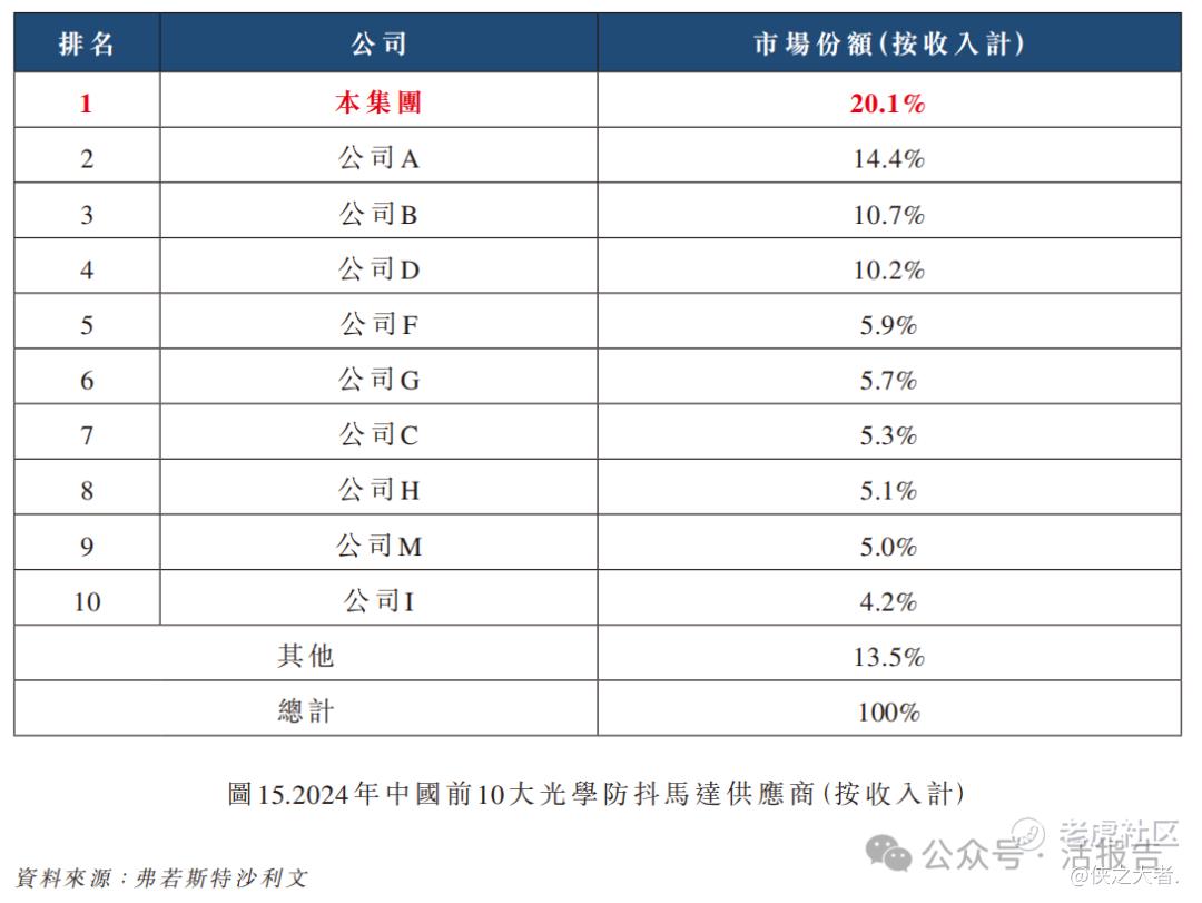 根据弗若斯特沙利文的资料,以2024年的收入计,公司在影像马达市场位列全球第六名、中国第三名,**国影像马达市场的9.1%。以2024年的收入计,在光学防抖(「光学防抖」)影像马达领域,公司位列全球第四名、中国第一名,**国市场份额的20.1%。