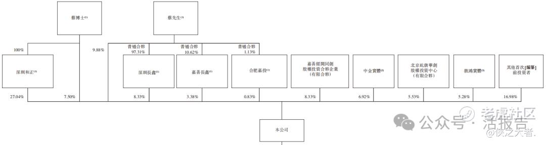 蔡振鹏博士直接持股17.38%(7.50%+9.88%),并通过其全资公司深圳和正间接持股27.04%,通过深圳长鑫、嘉善长鑫及合肥嘉投间接持股8.33%、3.38%及0.83%,合计持股约56.97%。