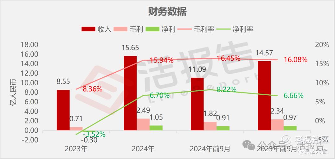 公司是微型精密马达制造商,2024年收入15.65亿元,净利润1.05亿元,毛利率15.94%。2025年前9月收入14.57亿元,净利润0.97亿元,毛利率16.08%。2025年前9月,公司收入毛利保持高增。