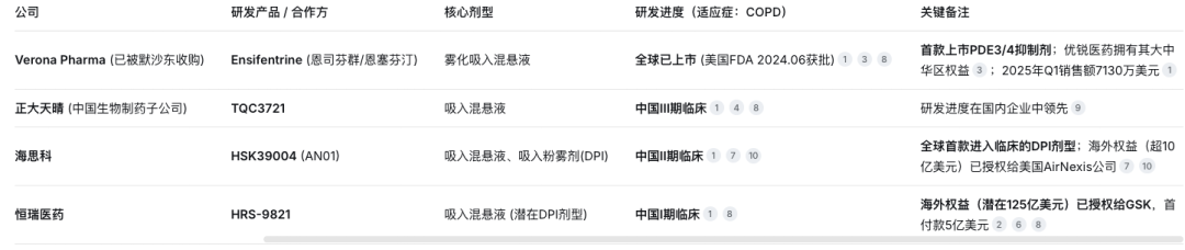 PDE3/4抑制剂是COPD 新机制的吸入疗法。它能同时抑制PDE3 和PDE4,实现支气管扩张以及抗炎效应。Verona的恩司芬群(Ensifentrine)是首款上市的PDE3/4 抑制剂,2024年6月其COPD适应症美国上市,商品名Ohtuvayre,国内达到COPD三期临床重点并提交NDA阶段(国内由优锐医药引进注册及商业化)。