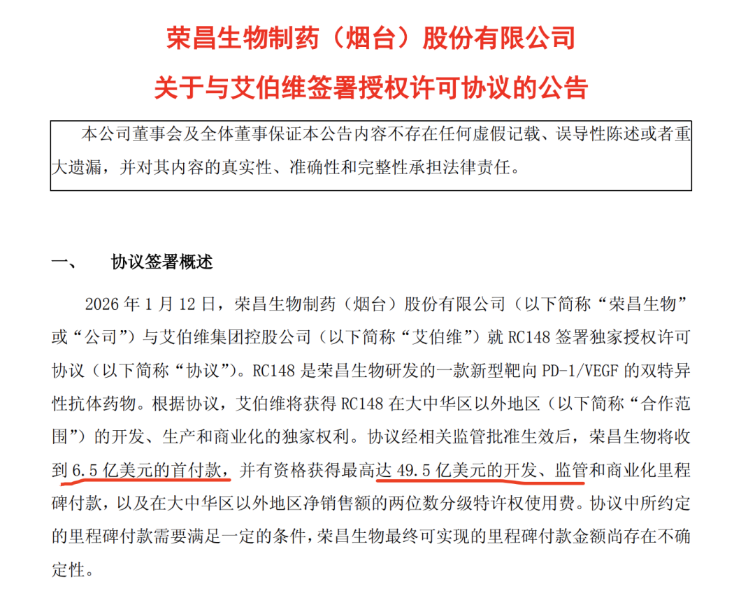 就在刚刚,荣昌生物宣布将PD-1/VEGF双抗RC148的大中华区外全球权益授权给艾伯维,荣昌生物将收到6.5亿美元预付款、49.5亿美元开发、监管和商业化里程碑金额,以及双位数百分比的销售分成。