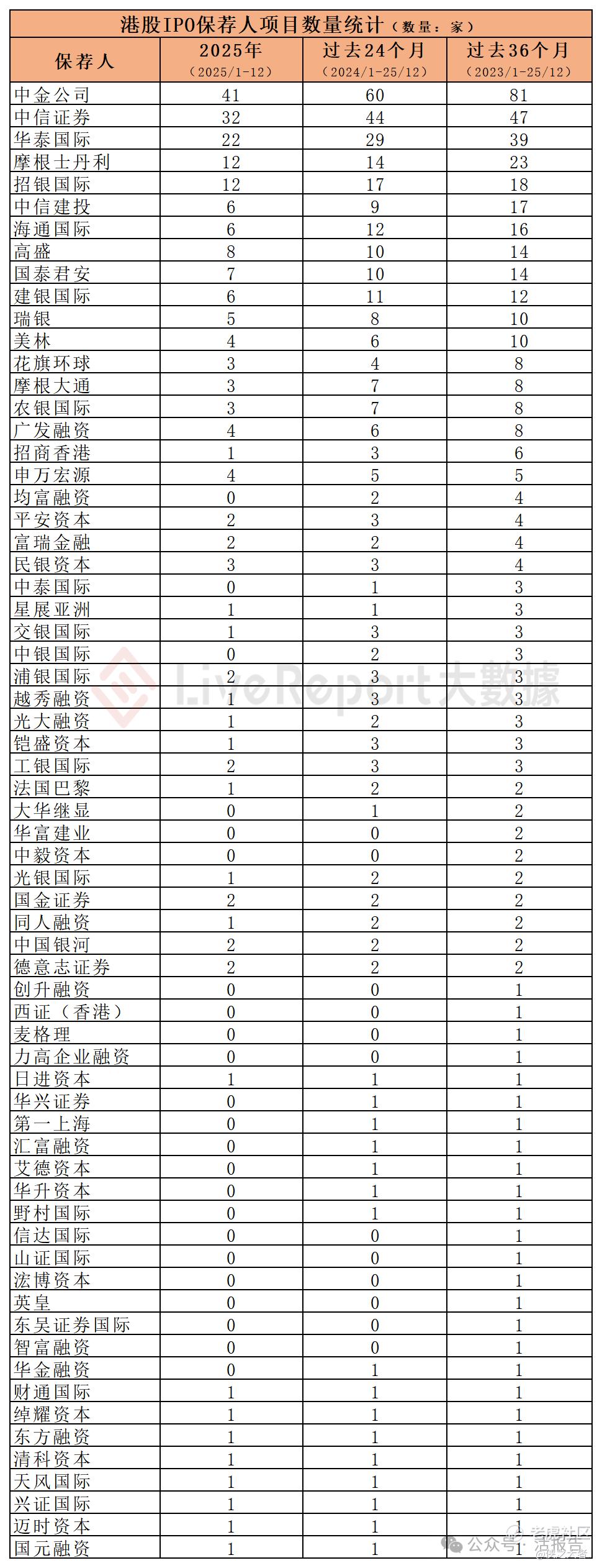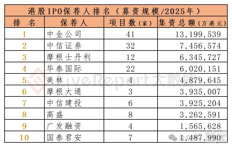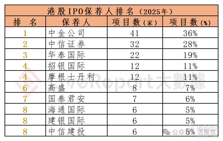 2025年1-12月,43家保荐人参与了114家港股IPO上市保荐,项目数量最多的保荐人为:① 中金公司(41家);② 中信证券(32家);③ 华泰国际(22家)。