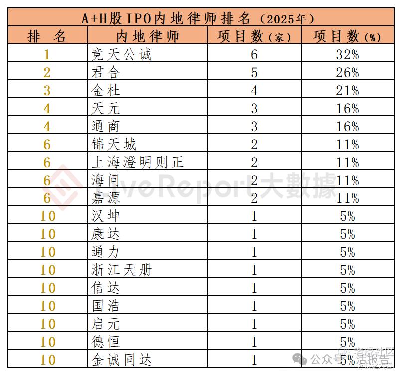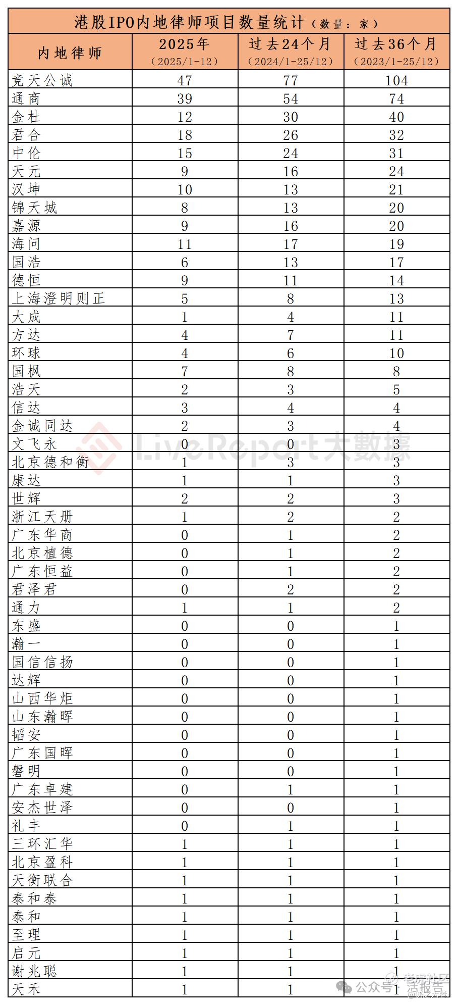 今年1-12月,34家内地律师为114家港股IPO提供了上市法律服务,项目数量最多的内地律师:① 竞天公诚(47家);② 通商(39家);③ 君合(18家)。