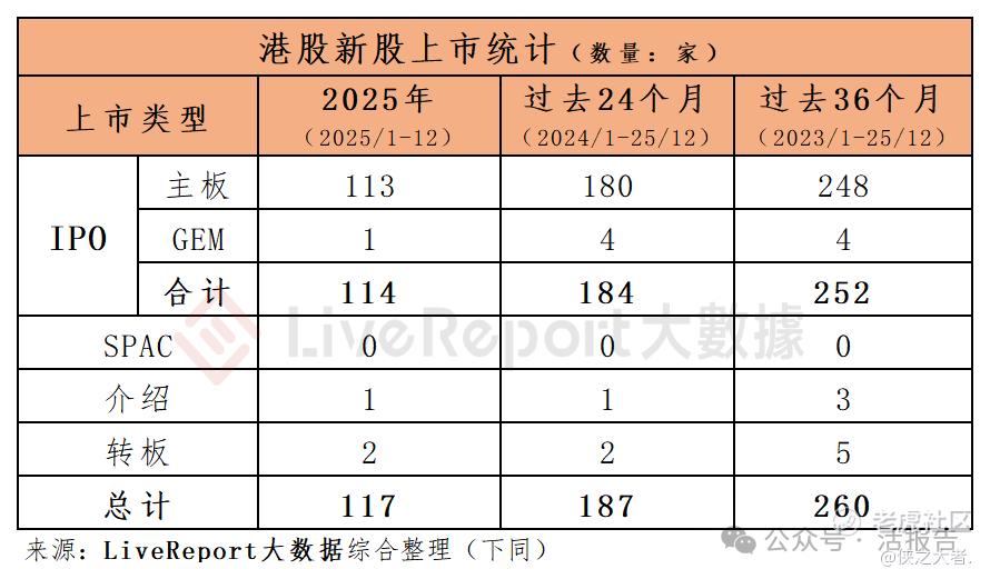 据**大数据,2025年1-12月,港股市场迎来新上市公司共117家,其中IPO上市114家,介绍上市1家,GEM转主板2家。截至12月底的过去24个月和36个月期间,新上市公司总数量则分别为187家和260家,其中IPO上市分别为184家和252家。