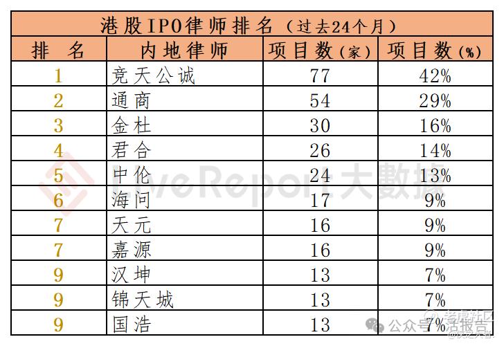 过去24个月期间,40家内地律师为184家港股IPO提供了上市法律服务,项目数量最多的内地律师:① 竞天公诚(77家);② 通商(54家)、③ 金杜(30家)。