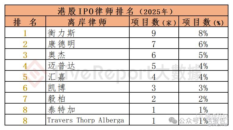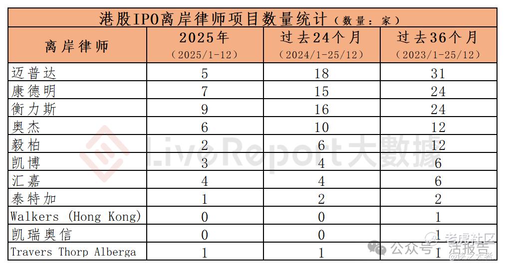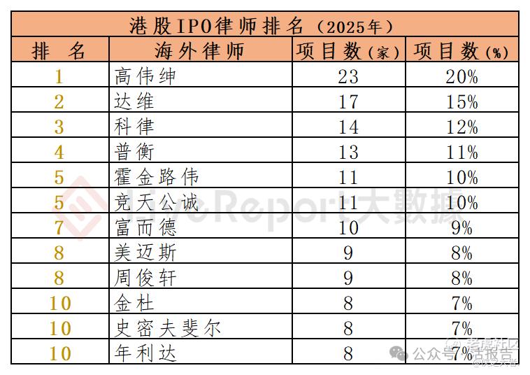 今年1-12月,122家海外律师为114家港股IPO提供了上市法律服务,项目数量最多的海外律师:① 高伟绅(23家);② 达维(17家);③ 科律(14家)。