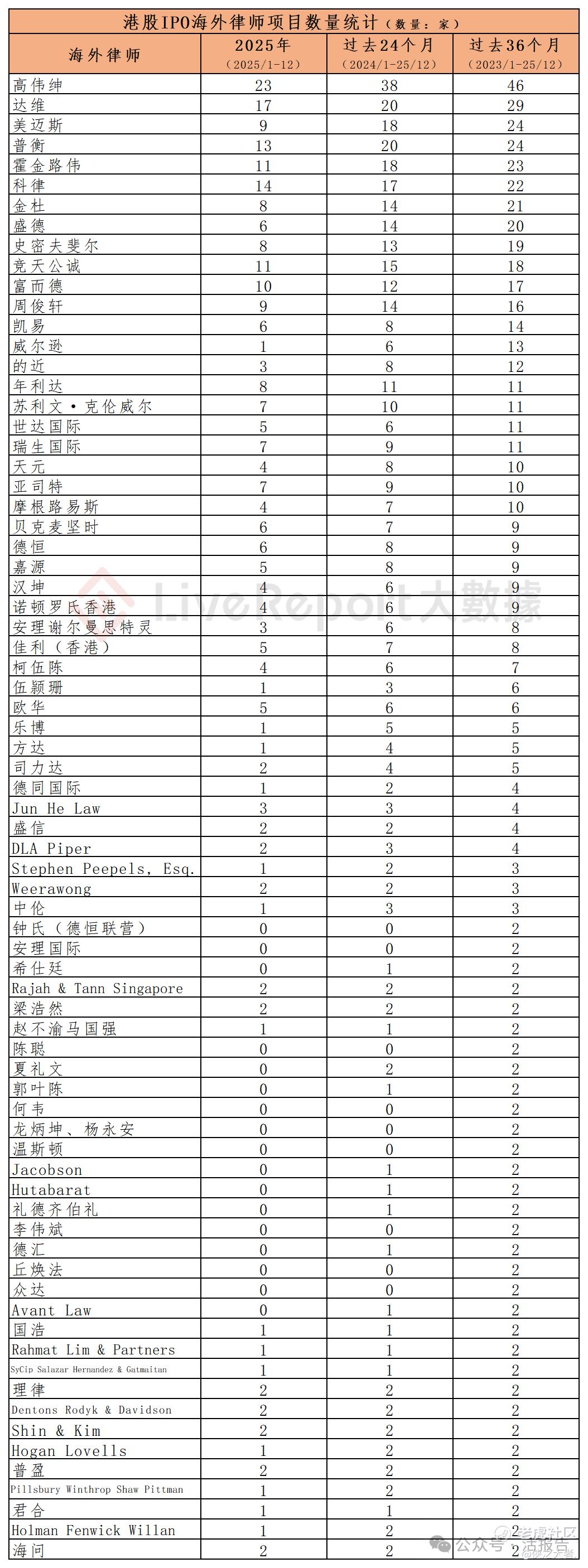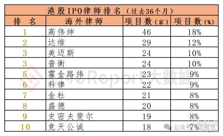 过去36个月期间,约203家海外律师为252家港股IPO提供了上市法律服务,项目数量最多的海外律师:① 高伟绅(46家);② 达维(29家);③ 美迈斯、普衡(各24家)。