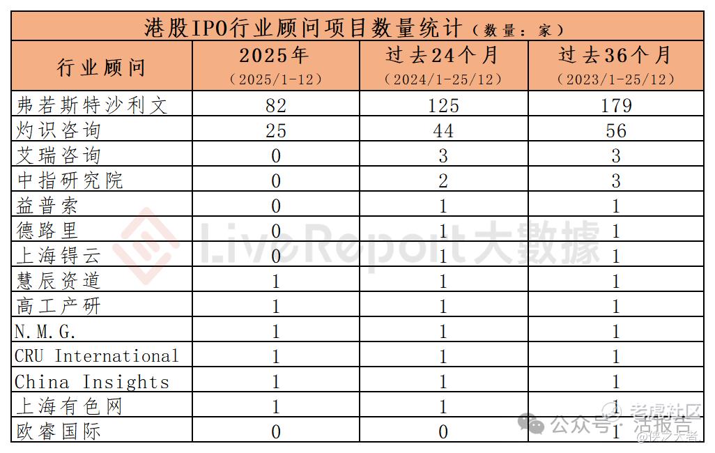 今年1-12月,以及过去24个月和36个月的统计期间,分别有8家、13家和14家行业顾问参与了港股IPO上市项目,各期间项目数量最多的行业顾问为:
