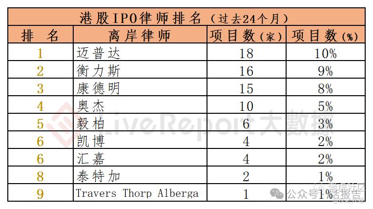 过去24个月期间,9家离岸律师为75家(开曼主体)港股IPO提供了上市法律服务,项目数量最多的离岸律师:① 迈普达(18家);② 衡力斯(16家);③ 康德明(15家)。
