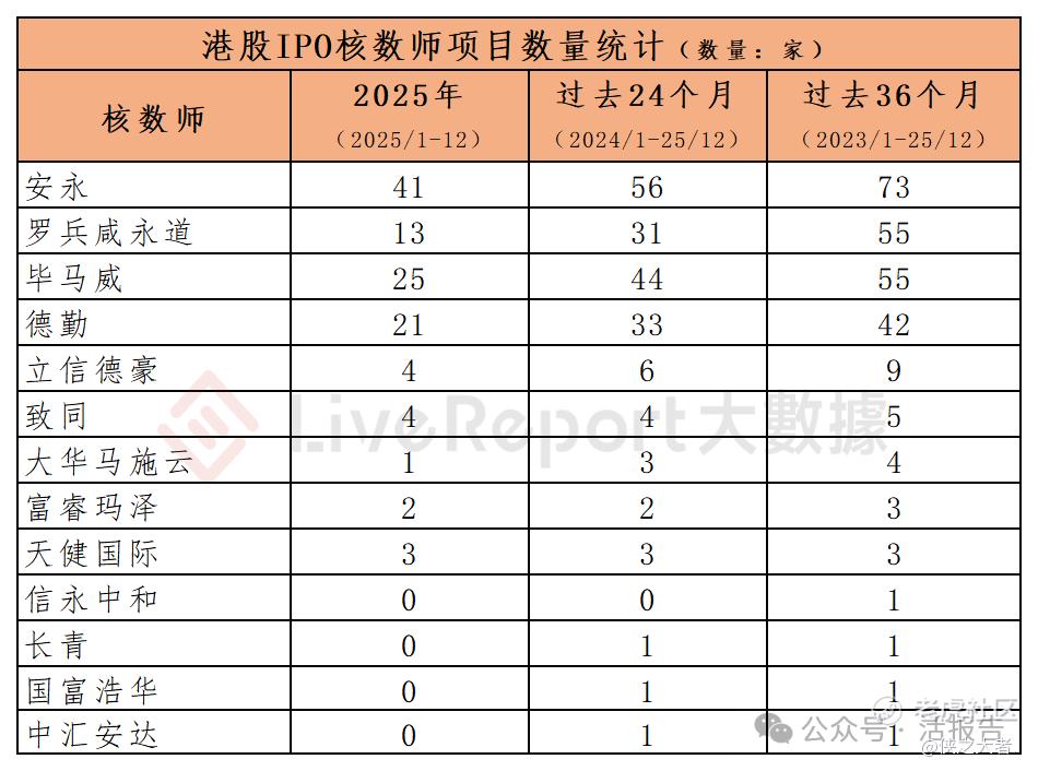 今年1-12月,以及过去24个月和36个月的统计期间,分别有9家、12家和13家核数师参与港股IPO上市审计,各期间项目数量最多的核数师为: