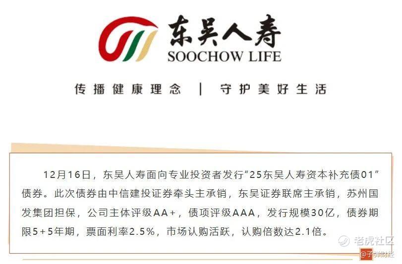 12月16日,东吴人寿面向专业投资者发行“25东吴人寿资本补充债01”债券。