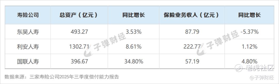 三家对比来看,截至2025年前三季度末,利安人寿规模优势明显,总资产1302.71亿元、保险业务收入222.77亿元,无论是资产规模还是保费规模,均远超东吴人寿、国联人寿。