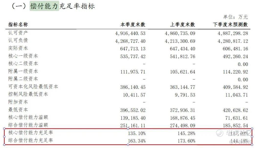 该公司核心偿付能力充足率135.10%,较上季度末数据下降10.18个百分点;综合偿付能力充足率163.34%,较上季度末下降10.27%。且其预测下季度两项指标将继续下降至117.03%、144.18%。