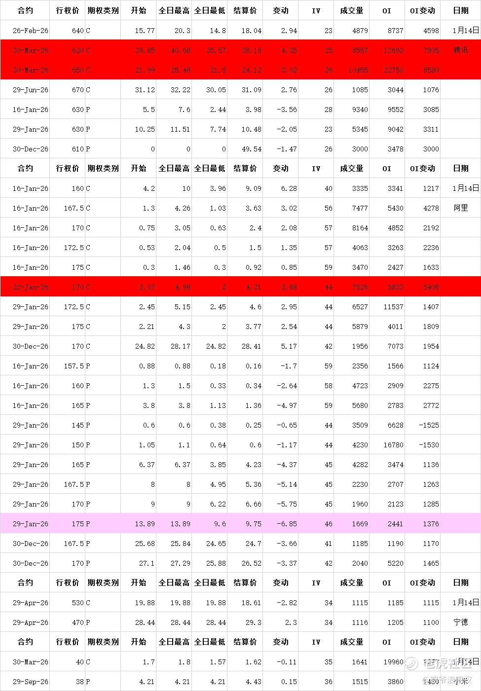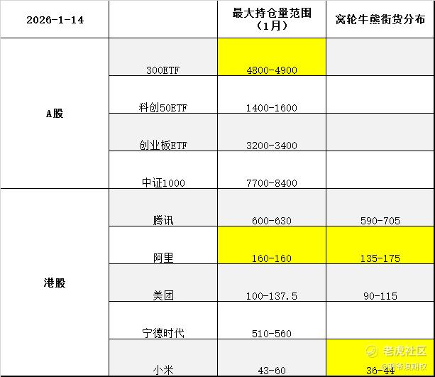 图一:今天大A的3个ETF和中证1000,以及港股的腾讯、阿里、美团、宁德和小米的最大持仓量范围以及窝轮牛熊分布范围,也就是1月的期权筹码分布,黄色的表示跟上个交易日有变动。
