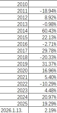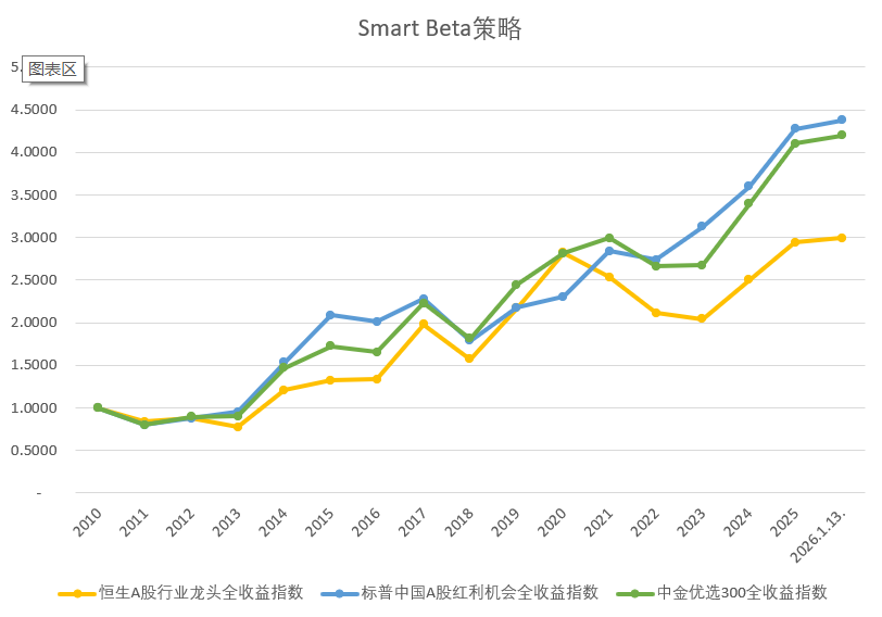 从2011年1月1日至2026年1月13日,恒生行业龙头全收益指数、标普红利机会全收益指数、中金优选300全收益指数分别是2.9948倍、4.3782倍、4.1989倍。平均收益3.8573倍。