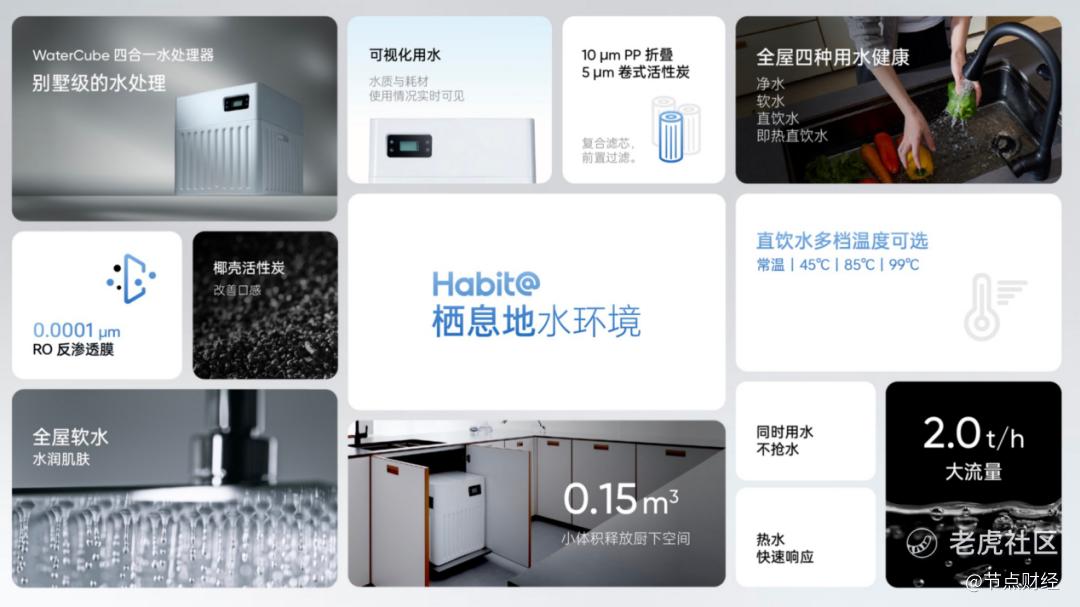 然后是水环境。这是我们自主研发的核心产品,它的体积只有0.15立方米,却能解决全家所有的用水需求——进水、软水、直饮水、直饮加热一站式搞定。全屋每个水龙头出来的水都是“定制化”的:洗菜用净水,喝水用直饮水,洗澡、洗衣服用软水,既能保证健康,还能减少水垢、保护皮肤,甚至能让男同志少掉点头发。而且因为是前装集成化设计,它的成本是下降的,比传统家里买这一套不仅体积更小,而且成本更低。