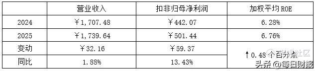 财报显示,浦发银行2025年全年实现营收1739.64亿元,同比增长1.88%;扣非归母净利润延续高质量态势,同比增长13.43%至501.44亿元。重点在于,虽然可转债转股大幅提升了股本,但在利润强劲的增长下并未稀释股东回报率,加权平均ROE较2024年提升0.48个百分点至6.76%。
