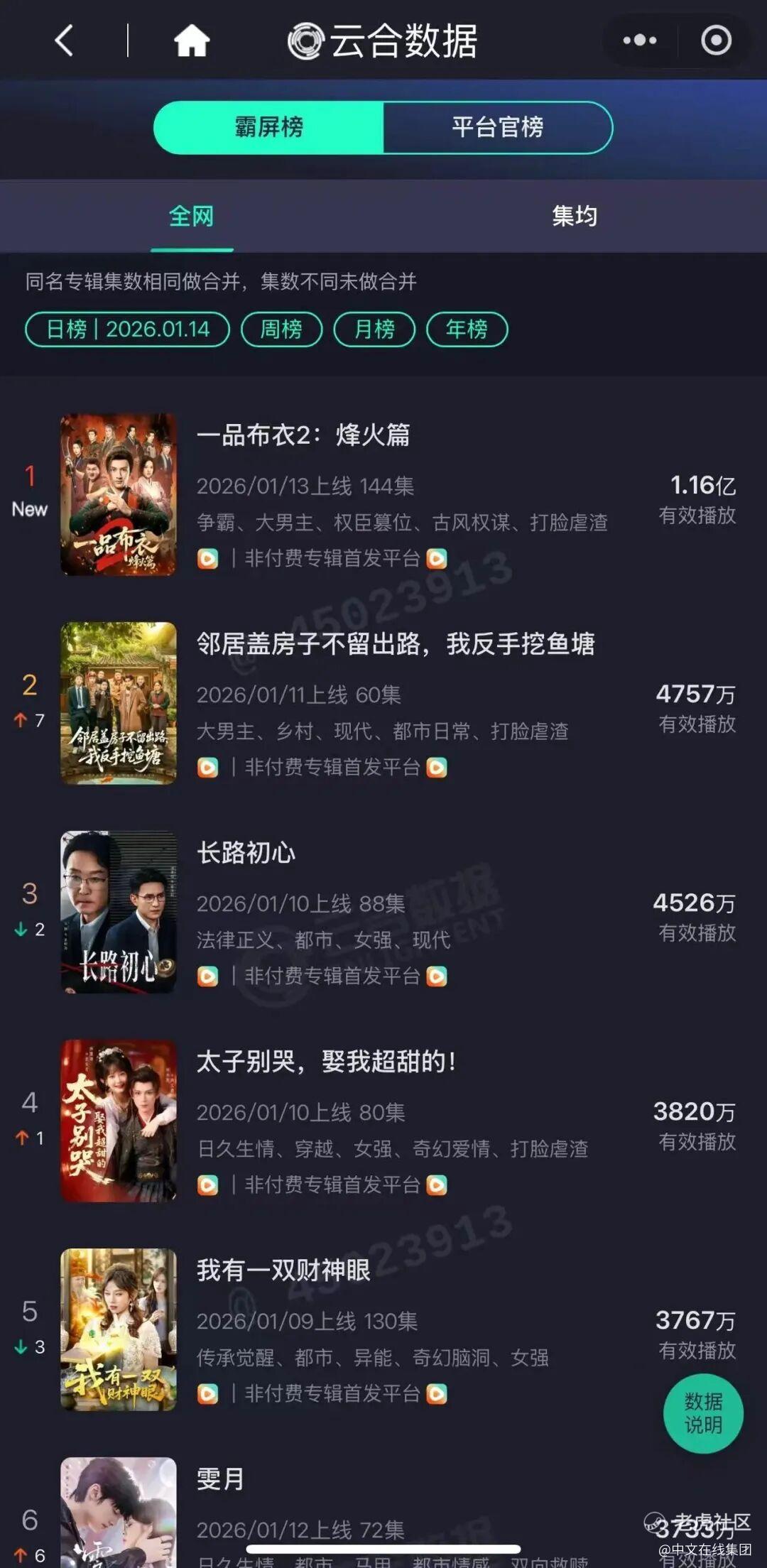 作为中文在线深耕IP影视化的重要作品,古装权谋短剧《一品布衣2:烽火篇》自1月13日登陆红果平台以来,凭借扎实的内容与精良制作收获市场认可。截至1月14日,该剧有效播放量突破1.16亿,以超7718万综合热度登顶红果短剧热播榜总榜,成为2026年初短剧市场的亮眼之作。