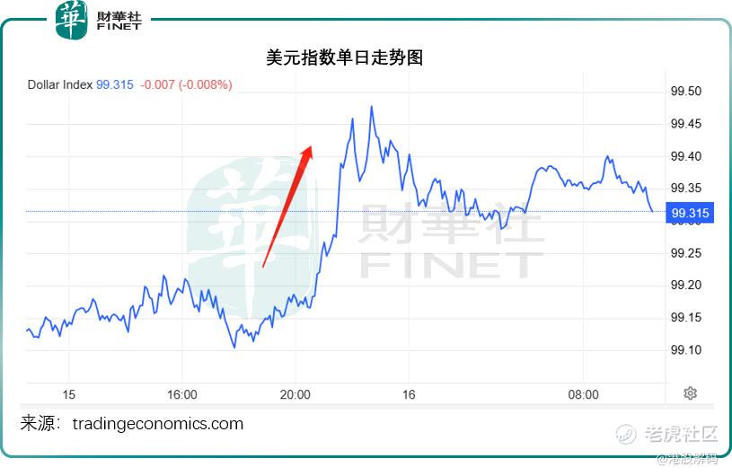 受此推动,美元指数走强,见下图,美元指数99.1水平上升至99.3,并保持。