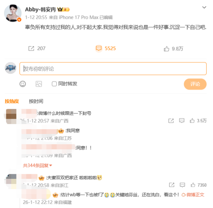 1月12日晚,当韩安冉在微博发出这句道歉时,韩安冉(粉丝320万)与宋浩然(粉丝142.3万)的抖音主账号被永久封禁,页面提示“违反《抖音社区自律公约》”,所有内容清空无法访问。封禁,来得无声而彻底。从热搜常客到查无此号,不过转瞬之间。那个曾经靠着“变形计”走入大众视野,又凭借一系列婚恋纠葛、争议话题牢牢占据流量高地的韩安冉,以一种近乎惨烈的方式,暂时退出了舞台中央。