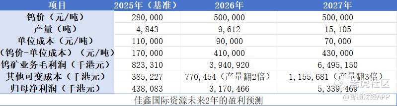 若假设 2026、2027 两年钨矿中枢价格维持在 50 万元的高位,且其他可变成本根据 2025 年的产量对应的成本做线性外推,那么佳鑫国际资源 2026、2027 年的归母净利润或有望分别达 31.7 亿、53.4 亿港元。