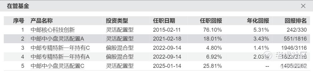 在现有的基金经理之中,曹思的任职时间最长,达到11.62年。她管理的基金产品中,截至2025年1月14日,“中邮核心科技创新”的年化回报最高,达到5.31%。而“中邮专精特新一年持有C”的年化回报最低,仅为1.41%。