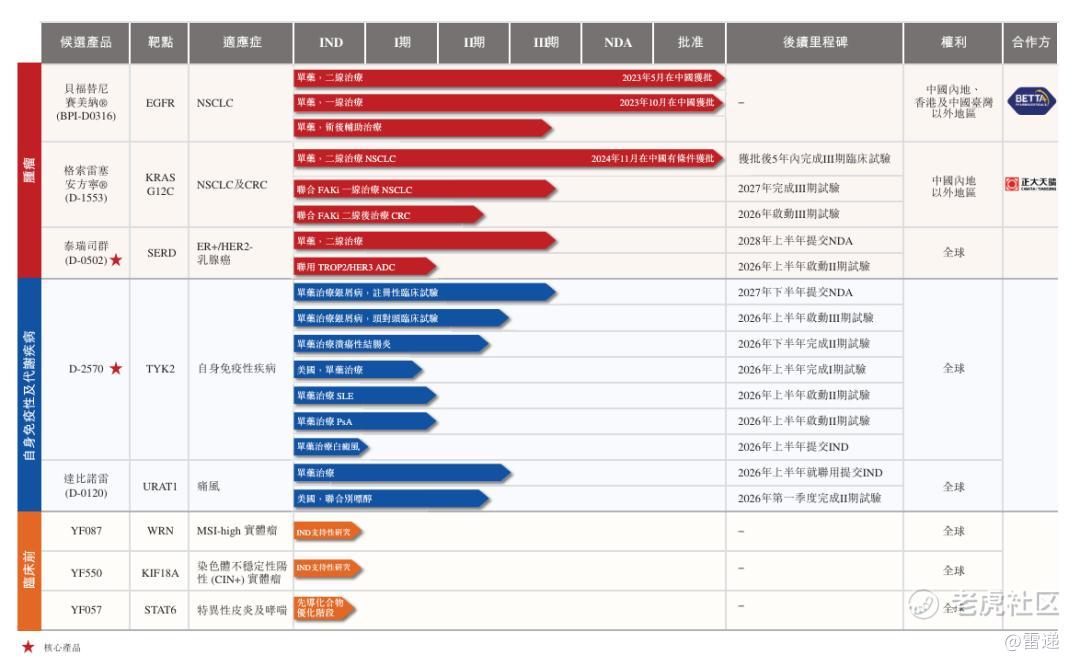 益方生物的核心产品酪氨酸激酶2(「TYK2」)抑制剂D-2570和口服选择性雌激素受体降解剂(「SERD」)泰瑞司群(D-0502)正在开展注册性III期临床试验,尿酸盐转运体1(「URAT1」)抑制剂达比诺雷(D-0120)已完成IIb期临床试验。