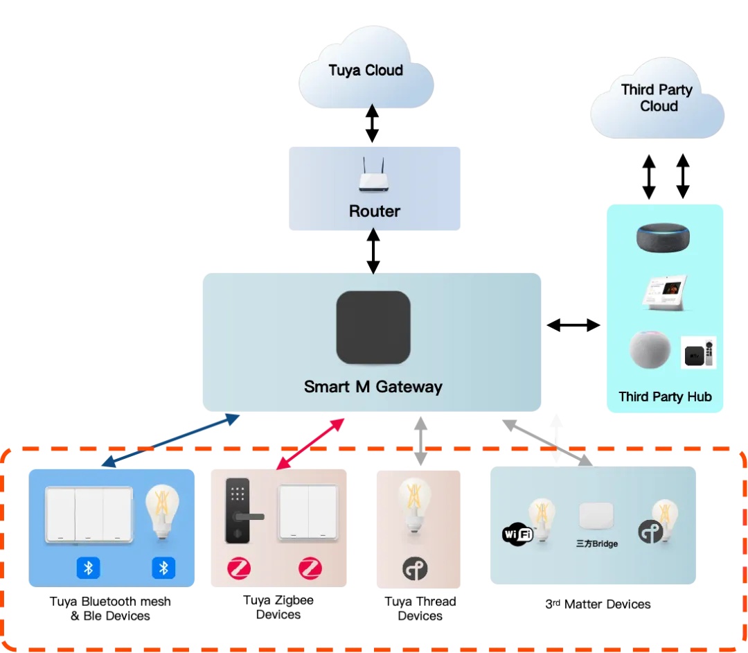 智慧多模网关同时具备Bridge、Controller、Border Router能力,支持六大类设备接入和桥接:涂鸦生态的Zigbee设备、蓝牙设备(Bluetooth LE & Bluetooth Mesh)、Thread设备,以及第三方的Matter over Thread、Matter over Wi-Fi和Matter Bridge设备,真正实现了既有生态设备互通和跨多平台互联,将设备连接与控制完美和苹果、谷歌、三星、亚马逊等平台融合。这极大保护了用户与品牌商的现有设备投资,同时也极大的拓宽了用户对智能产品的选择范围。