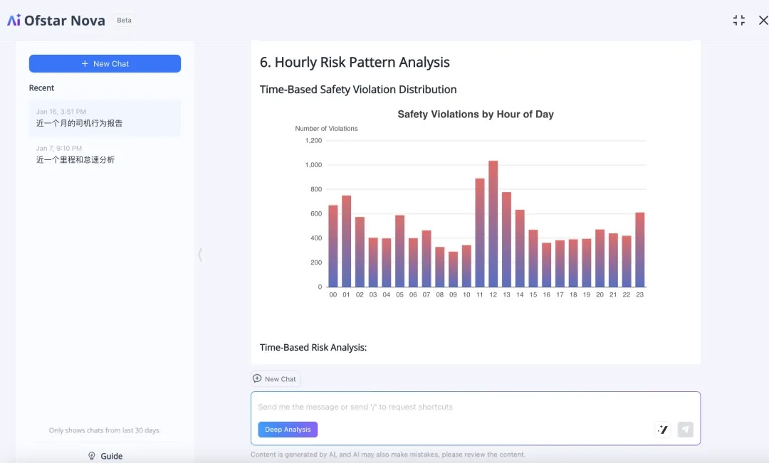 作为车队的智能伙伴,Ofstar Assistant能够通过学习管理者的业务需求和逻辑,主动进行数据分析和业务判断,帮助管理者做出更精准的决策:
