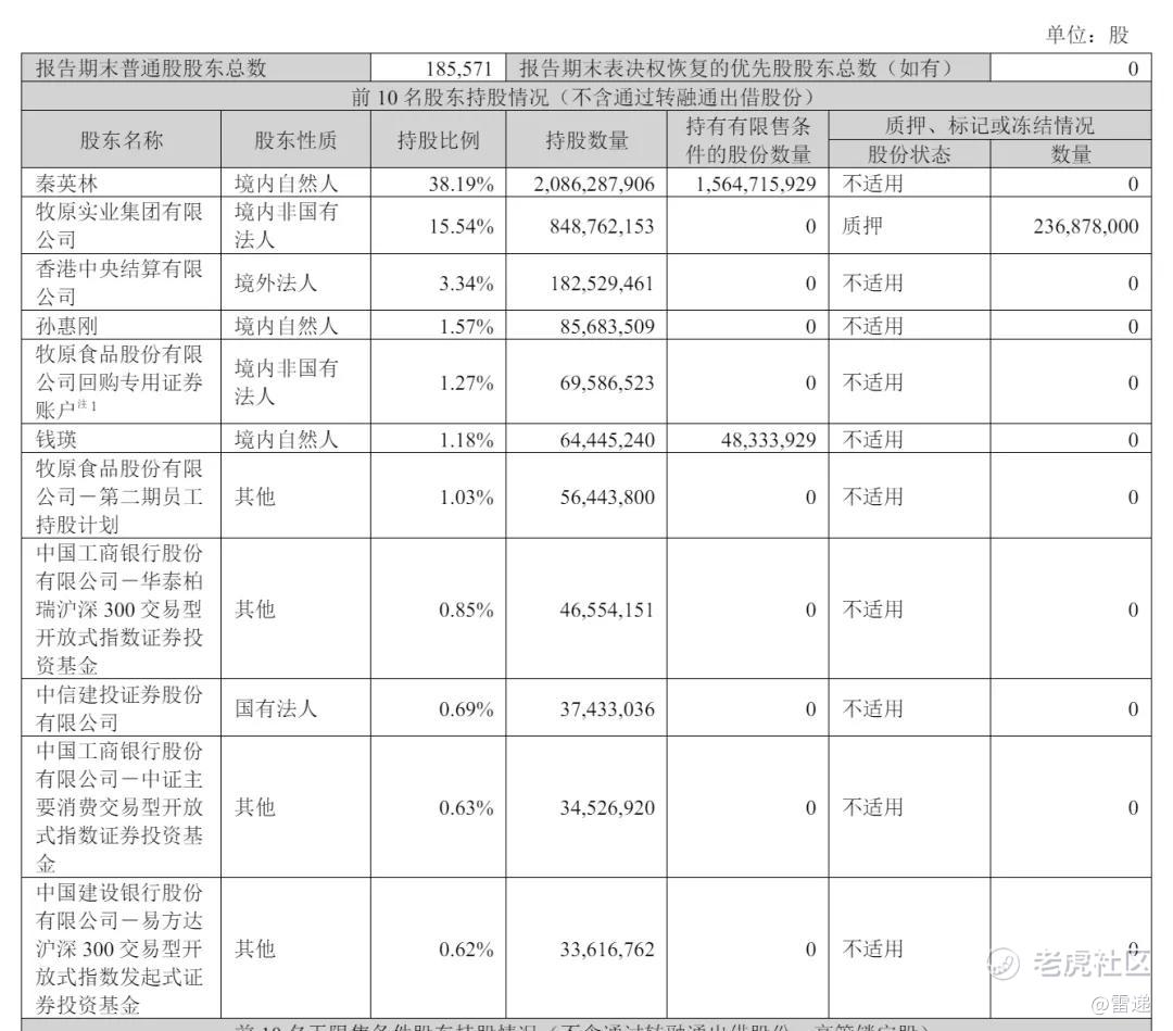 截至2025年9月30日,秦英林持股为38.19%,牧原实业集团有限公司持股为15.54%,香港中央结算有限公司持股为3.34%,孙惠刚持股为1.57%,牧原食品股份有限公司回购专用证券账户持股为1.27%,钱瑛持股为1.18%,牧原食品股份有限公司-第二期员工持股计划持股为1.03%。