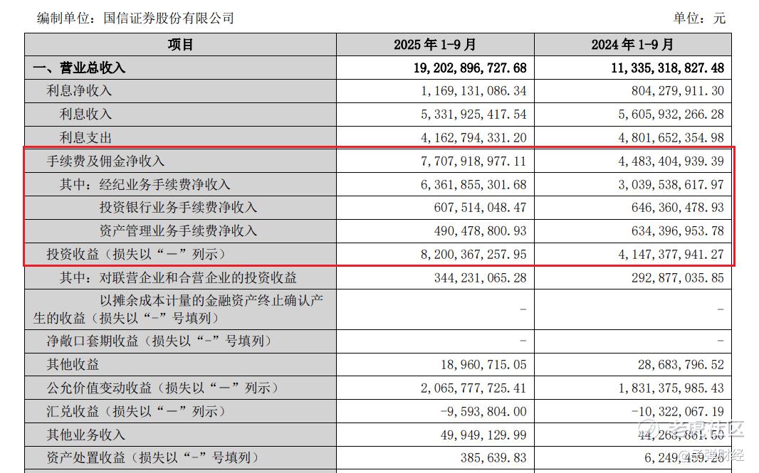 2025年前三季度,国信证券投资收益达82亿元,同比大增97.73%,主要源于金融工具投资收益的大幅增加。
