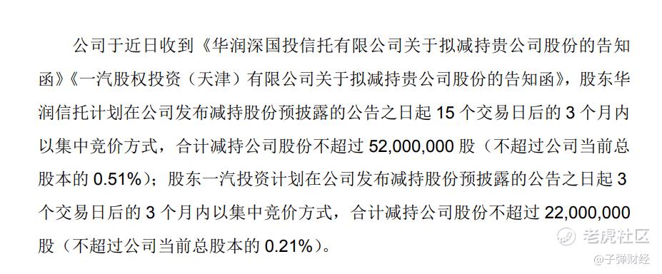 1、一汽投资、华润信托两大股东同步减持