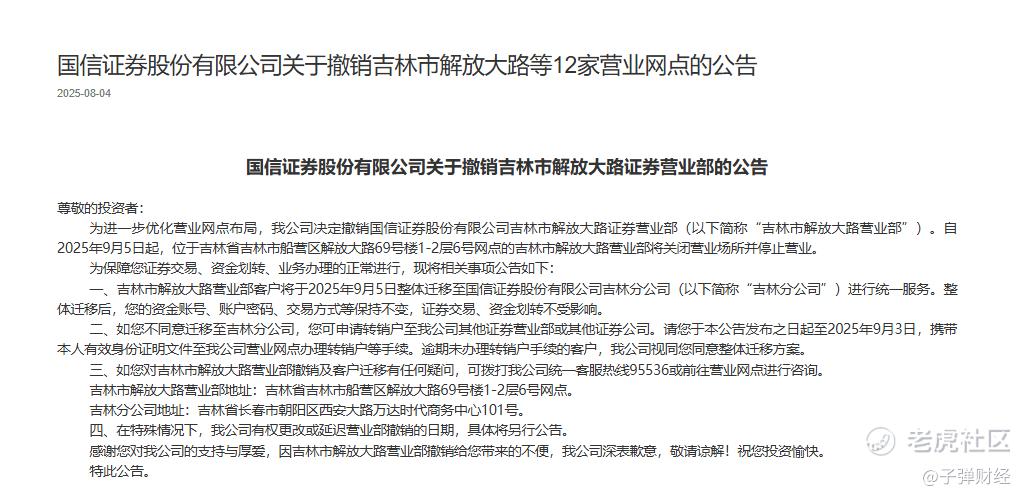 而就在此公告发布一个月前,国信证券2025年7月发布公告称,于8月1日起正式关闭大庆龙政路、大同永泰南路、长沙五一大道、通化光明路等9家营业部。