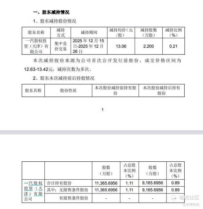 公告显示,一汽投资在2025年12月15日至12月26日期间完成了全部计划减持量,即顶格减持2200万股。本次减持股份来源为公司首次公开发行前股份,减持期间成交价格区间为12.63元/股至13.42元/股,减持次数为多次。