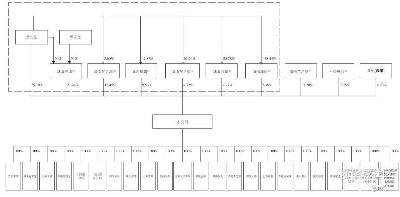 其中:珠海坤泽由亓先生及商女士分别持有60%及40%股权。济南花之源、海南胤睿、海南花之效、珠海邦华及海南瑾妍均由亓先生作为普通合伙人控制。