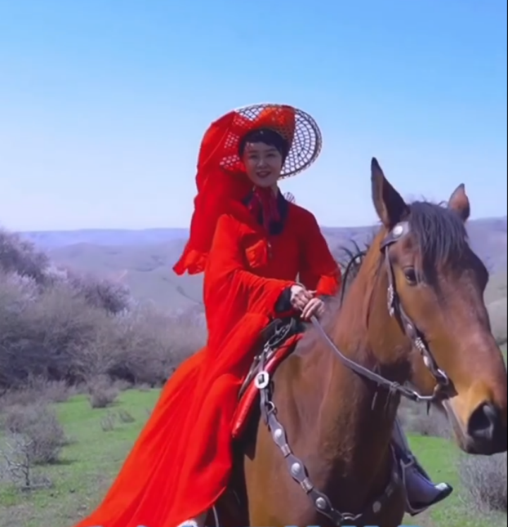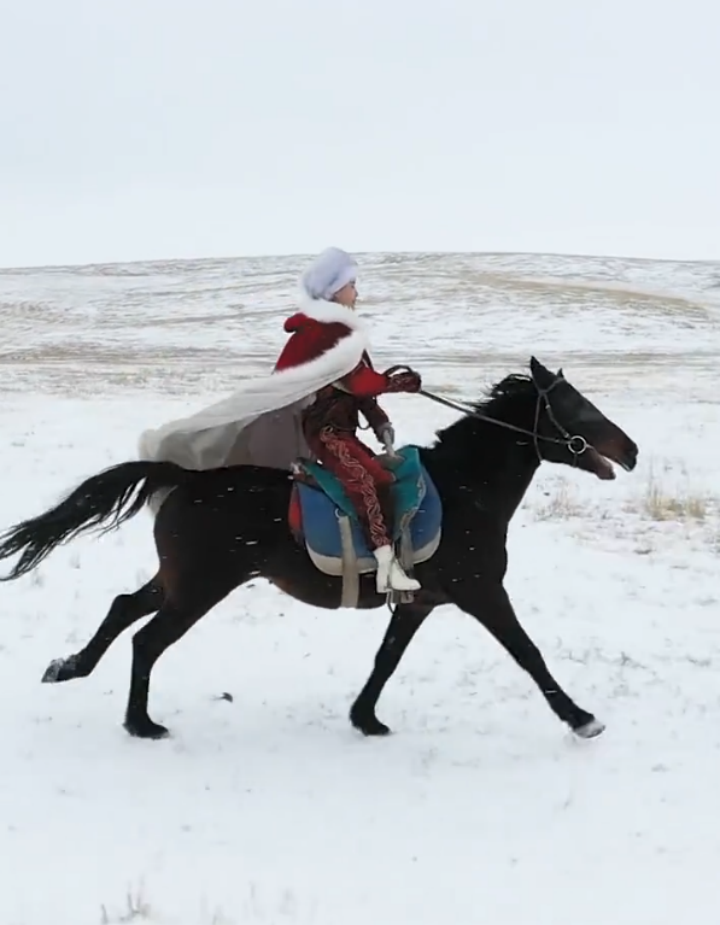 真正的转机出现在2020年11月。昭苏的冬天来得格外早,雪下得很深。贺娇龙一袭红袍,策马在雪原上奔驰。