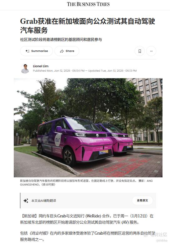 大家都知道,新加坡在积极推动自动驾驶发展,作为其智慧国家战略的一部分,政府支持研发测试,目前已有多家公司(如文远知行)在当地进行商业化运营和技术测试,主要覆盖特定区域的自动驾驶接驳和环卫等场景,新闻也经常播放相关新闻。例如, $Grab Holdings(GRAB)$ 就拿到了测试资格,并已经开始了自动驾驶的测试。《8视界新闻网》早前报道,榜鹅将会有三条无人驾驶接驳车路线穿梭在市镇内。由Grab和文远知行WeRide,负责的1号路线,2026年1月12日起率先邀请公众试乘。