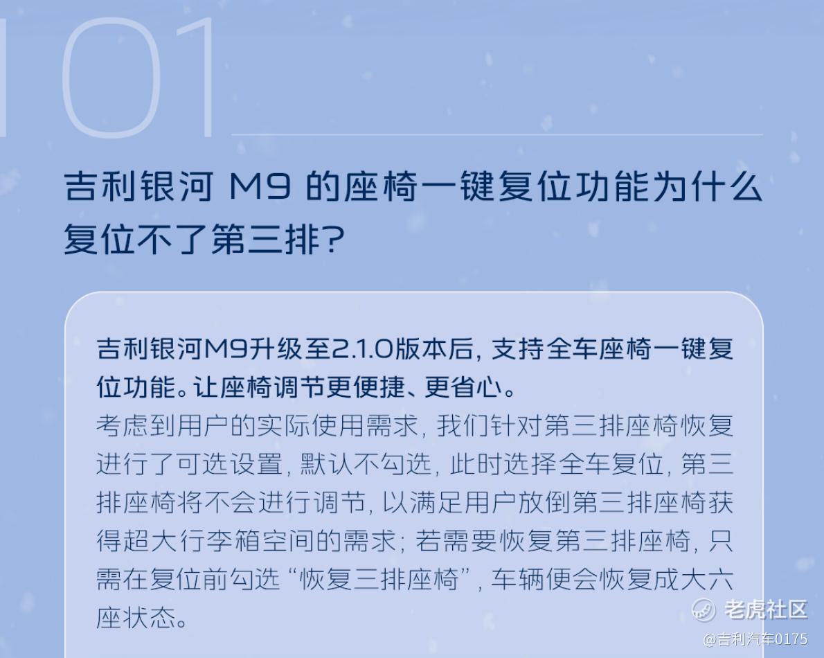 {"i18n":{"language":"zh_CN"},"detailType":1,"isChannel":false,"data":{"magic":2,"id":523383841154136,"tweetId":"523383841154136","gmtCreate":1768802724935,"gmtModify":1768804461923,"author":{"id":3570925126401945,"idStr":"3570925126401945","authorId":3570925126401945,"authorIdStr":"3570925126401945","name":"吉利汽车0175","avatar":"https://static.tigerbbs.com/3f1b7526951e77ea7c2ad4b9151f5cf0","vip":5,"userType":5,"introduction":"吉利汽车集团官方账号","boolIsFan":false,"boolIsHead":false,"crmLevel":1,"crmLevelSwitch":0,"individualDisplayBadges":[],"fanSize":7416,"starInvestorFlag":false},"themes":[],"images":[{"img":"https://static.tigerbbs.com/aa7401679d0cbdf38cc2434ee43f0b8c","width":"1190","height":"1458"},{"img":"https://static.tigerbbs.com/83c5859c8058d93da05085c936a9dbcf","width":"1194","height":"696"},{"img":"https://static.tigerbbs.com/af5061c36878d5f62bfaec405a9d28f1","width":"1190","height":"950"},{"img":"https://static.tigerbbs.com/1e84e95f97469ee743715212dfc8a145","width":"1192","height":"760"},{"img":"https://static.tigerbbs.com/eeaef7f6788dee21ffcc9516dffc5286","width":"1194","height":"1076"},{"img":"https://static.tigerbbs.com/b585efb9a32a2cfa2e6ef0248b3ccd60","width":"1194","height":"770"},{"img":"https://static.tigerbbs.com/ec843836c896d41b7ae124a6f9c26194","width":"1188","height":"350"},{"img":"https://static.tigerbbs.com/ba965aad8a2eafc8e1414de8ef0a9ab2","width":"1192","height":"1262"},{"img":"https://static.tigerbbs.com/60459f6b11ecf6afeb534f974aa79ece","width":"1196","height":"428"},{"img":"https://static.tigerbbs.com/85ba1902c29a0618b0cf294ee18c849e","width":"1192","height":"1474"},{"img":"https://static.tigerbbs.com/12b035357f930c6ed573c6a0faf6e15c","width":"1194","height":"1400"},{"img":"https://static.tigerbbs.com/a910838ca43006258c40db3061345cae","width":"1194","height":"634"}],"coverImages":[{"img":"https://static.tigerbbs.com/aa7401679d0cbdf38cc2434ee43f0b8c","width":"1190","height":"1458"},{"img":"https://static.tigerbbs.com/83c5859c8058d93da05085c936a9dbcf","width":"1194","height":"696"},{"img":"https://static.tigerbbs.com/af5061c36878d5f62bfaec405a9d28f1","width":"1190","height":"950"}],"title":"吉利银河M9答网友问(第七期)","html":"<html><head></head><body><p>吉利银河M9答网友问第七期新鲜出炉,为你解决每一个用车困惑!</p>\n<p class=\"t-img-caption\"><img src=\"https://static.tigerbbs.com/aa7401679d0cbdf38cc2434ee43f0b8c\" tg-width=\"1190\" tg-height=\"1458\"></p>\n<p class=\"t-img-caption\"><img src=\"https://static.tigerbbs.com/83c5859c8058d93da05085c936a9dbcf\" tg-width=\"1194\" tg-height=\"696\"></p>\n<p class=\"t-img-caption\"><img src=\"https://static.tigerbbs.com/af5061c36878d5f62bfaec405a9d28f1\" tg-width=\"1190\" tg-height=\"950\"></p>\n<p class=\"t-img-caption\"><img src=\"https://static.tigerbbs.com/1e84e95f97469ee743715212dfc8a145\" tg-width=\"1192\" tg-height=\"760\"></p>\n<p class=\"t-img-caption\"><img src=\"https://static.tigerbbs.com/eeaef7f6788dee21ffcc9516dffc5286\" tg-width=\"1194\" tg-height=\"1076\"></p>\n<p class=\"t-img-caption\"><img src=\"https://static.tigerbbs.com/b585efb9a32a2cfa2e6ef0248b3ccd60\" tg-width=\"1194\" tg-height=\"770\"></p>\n<p class=\"t-img-caption\"><img src=\"https://static.tigerbbs.com/ec843836c896d41b7ae124a6f9c26194\" tg-width=\"1188\" tg-height=\"350\"></p>\n<p class=\"t-img-caption\"><img src=\"https://static.tigerbbs.com/ba965aad8a2eafc8e1414de8ef0a9ab2\" tg-width=\"1192\" tg-height=\"1262\"></p>\n<p class=\"t-img-caption\"><img src=\"https://static.tigerbbs.com/60459f6b11ecf6afeb534f974aa79ece\" tg-width=\"1196\" tg-height=\"428\"></p>\n<p class=\"t-img-caption\"><img src=\"https://static.tigerbbs.com/85ba1902c29a0618b0cf294ee18c849e\" tg-width=\"1192\" tg-height=\"1474\"></p>\n<p class=\"t-img-caption\"><img src=\"https://static.tigerbbs.com/12b035357f930c6ed573c6a0faf6e15c\" tg-width=\"1194\" tg-height=\"1400\"></p>\n<p class=\"t-img-caption\"><img src=\"https://static.tigerbbs.com/a910838ca43006258c40db3061345cae\" tg-width=\"1194\" tg-height=\"634\"></p>\n<p style=\"text-align: justify;\">*所涉及产品配置,以线下门店实车为准</p>\n<p style=\"text-align: justify;\">*具体详情咨询吉利银河当地授权经销商</p></body></html>","htmlText":"<html><head></head><body><p>吉利银河M9答网友问第七期新鲜出炉,为你解决每一个用车困惑!</p>\n<p class=\"t-img-caption\"><img src=\"https://static.tigerbbs.com/aa7401679d0cbdf38cc2434ee43f0b8c\" tg-width=\"1190\" tg-height=\"1458\"></p>\n<p class=\"t-img-caption\"><img src=\"https://static.tigerbbs.com/83c5859c8058d93da05085c936a9dbcf\" tg-width=\"1194\" tg-height=\"696\"></p>\n<p class=\"t-img-caption\"><img src=\"https://static.tigerbbs.com/af5061c36878d5f62bfaec405a9d28f1\" tg-width=\"1190\" tg-height=\"950\"></p>\n<p class=\"t-img-caption\"><img src=\"https://static.tigerbbs.com/1e84e95f97469ee743715212dfc8a145\" tg-width=\"1192\" tg-height=\"760\"></p>\n<p class=\"t-img-caption\"><img src=\"https://static.tigerbbs.com/eeaef7f6788dee21ffcc9516dffc5286\" tg-width=\"1194\" tg-height=\"1076\"></p>\n<p class=\"t-img-caption\"><img src=\"https://static.tigerbbs.com/b585efb9a32a2cfa2e6ef0248b3ccd60\" tg-width=\"1194\" tg-height=\"770\"></p>\n<p class=\"t-img-caption\"><img src=\"https://static.tigerbbs.com/ec843836c896d41b7ae124a6f9c26194\" tg-width=\"1188\" tg-height=\"350\"></p>\n<p class=\"t-img-caption\"><img src=\"https://static.tigerbbs.com/ba965aad8a2eafc8e1414de8ef0a9ab2\" tg-width=\"1192\" tg-height=\"1262\"></p>\n<p class=\"t-img-caption\"><img src=\"https://static.tigerbbs.com/60459f6b11ecf6afeb534f974aa79ece\" tg-width=\"1196\" tg-height=\"428\"></p>\n<p class=\"t-img-caption\"><img src=\"https://static.tigerbbs.com/85ba1902c29a0618b0cf294ee18c849e\" tg-width=\"1192\" tg-height=\"1474\"></p>\n<p class=\"t-img-caption\"><img src=\"https://static.tigerbbs.com/12b035357f930c6ed573c6a0faf6e15c\" tg-width=\"1194\" tg-height=\"1400\"></p>\n<p class=\"t-img-caption\"><img src=\"