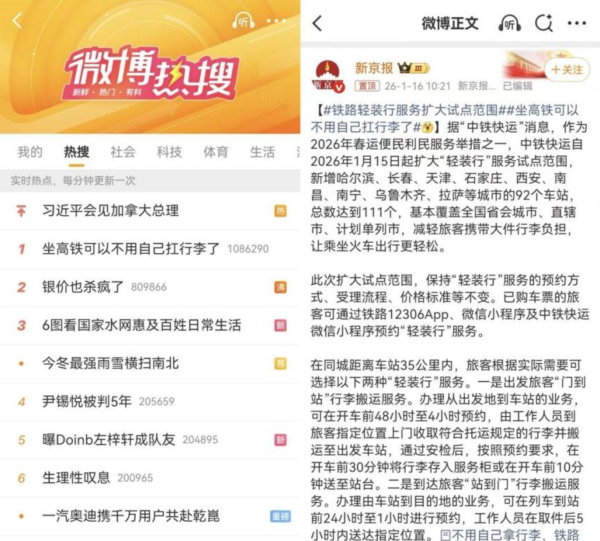 临近春运,#坐高铁可以不用自己扛行李了#话题登上热搜。据“中铁快运”消息,作为2026年春运便民利民服务举措之一,中铁快运自2026年1月15日起扩大“轻装行”服务试点范围,新增哈尔滨、长春、天津、石家庄、西安、南昌、南宁、乌鲁木齐、拉萨等城市的92个车站,服务站点增至111个,基本覆盖全国省会城市、直辖市、计划单列市。继此前与顺丰同城合作在北京西、上海虹桥、广州南等19座车站成功试点后,此次扩大次服务范围将继续由顺丰同城提供行李配送支持,通过“门到站”“站到门”同城搬运模式,帮助旅客减轻大件行李携带负担,实现“空手到站、轻松出行”。