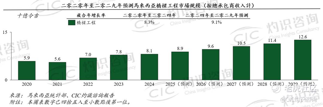 根据 CIC 灼识咨询报告,自2022年以来,在莎阿南高速公路(SUKE)、轻快铁第二号线(LRT2)及大众捷运第三号线(MRT3)等重大项目带动下,马来西亚桥梁工程需求保持强劲。2025年马来西亚国家预算案继续强调桥梁工程对经济发展的支撑作用,重点推进既有桥梁拓宽升级及跨海桥梁建设,并将东马相关项目列为优先。随着东海岸铁路等项目推进,市场有望稳步增长。2024年桥梁工程市场规模约81亿令吉,预计2029年增至126亿令吉,2024至2029年复合年增长率约9.1%。