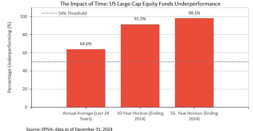 如果我们把时间维度拉长,分析结果更加清晰。在截至 2024 年底的十年周期内,91.54% 的美国大型股主动基金在风险调整后跑输基准;十五年周期内,这一比例进一步上升至 98.13%⁵。