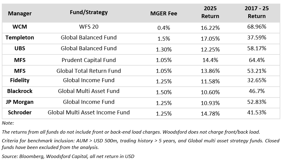上表比较了多只知名多资产基金的回报表现,包括我们的WFS。所有基金均为仅做多的全球多资产配置策略。WFS采用透明、系统化的投资策略,使用高质量、低成本 ETF,并以高度纪律化的方式进行再平衡。由于资产存放于独立管理账户,投资者始终可以清楚了解持仓情况。我们的管理费在同业中处于最低水平。